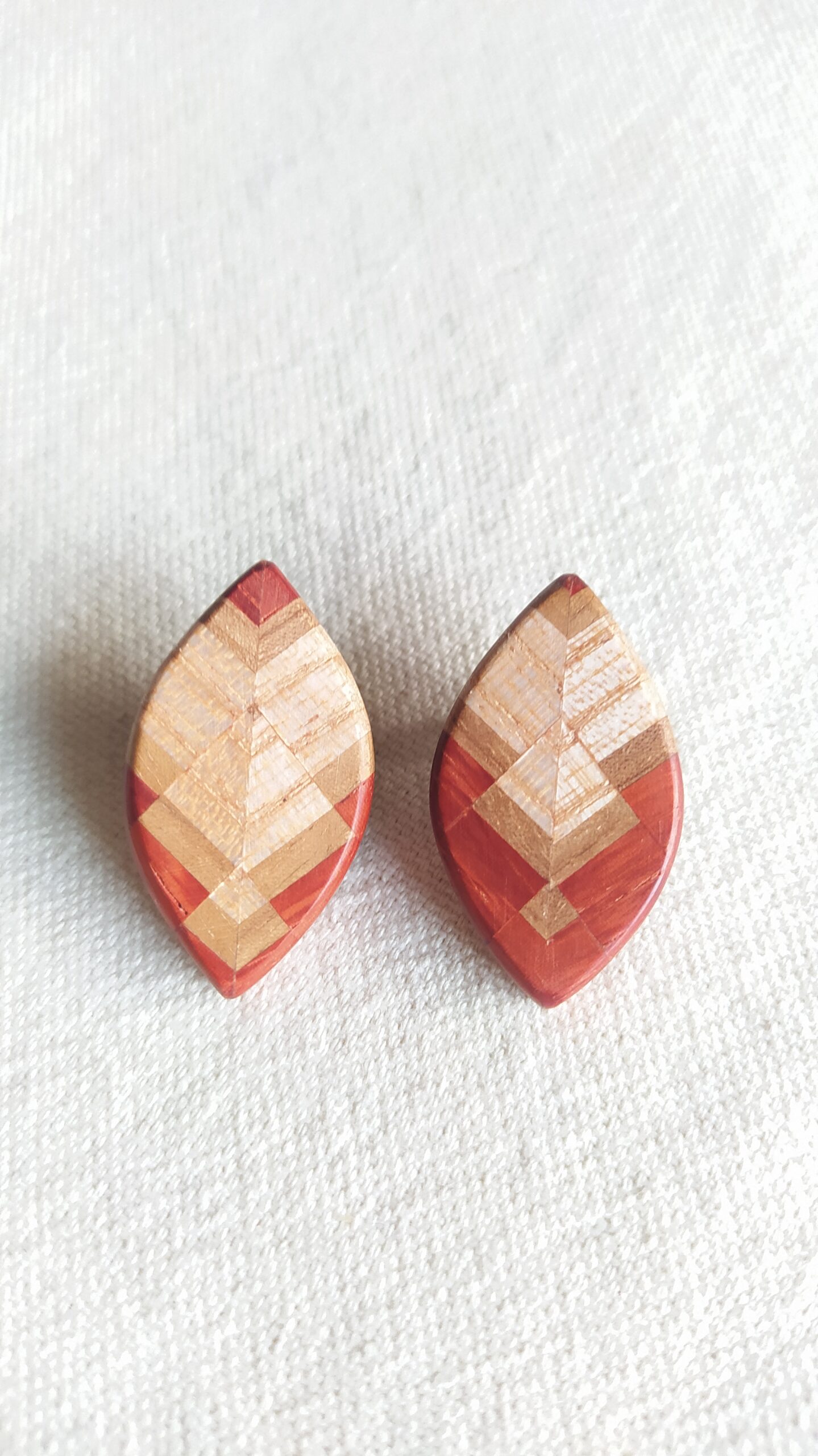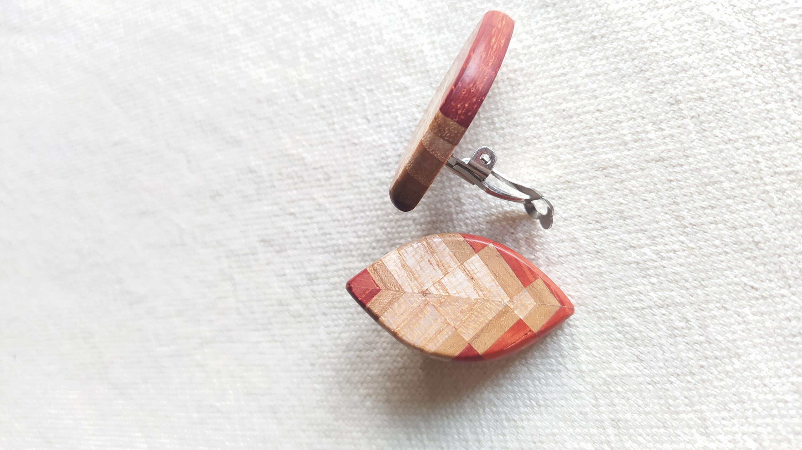 Boucle d’oreille en bois de frêne, noyer et padouk